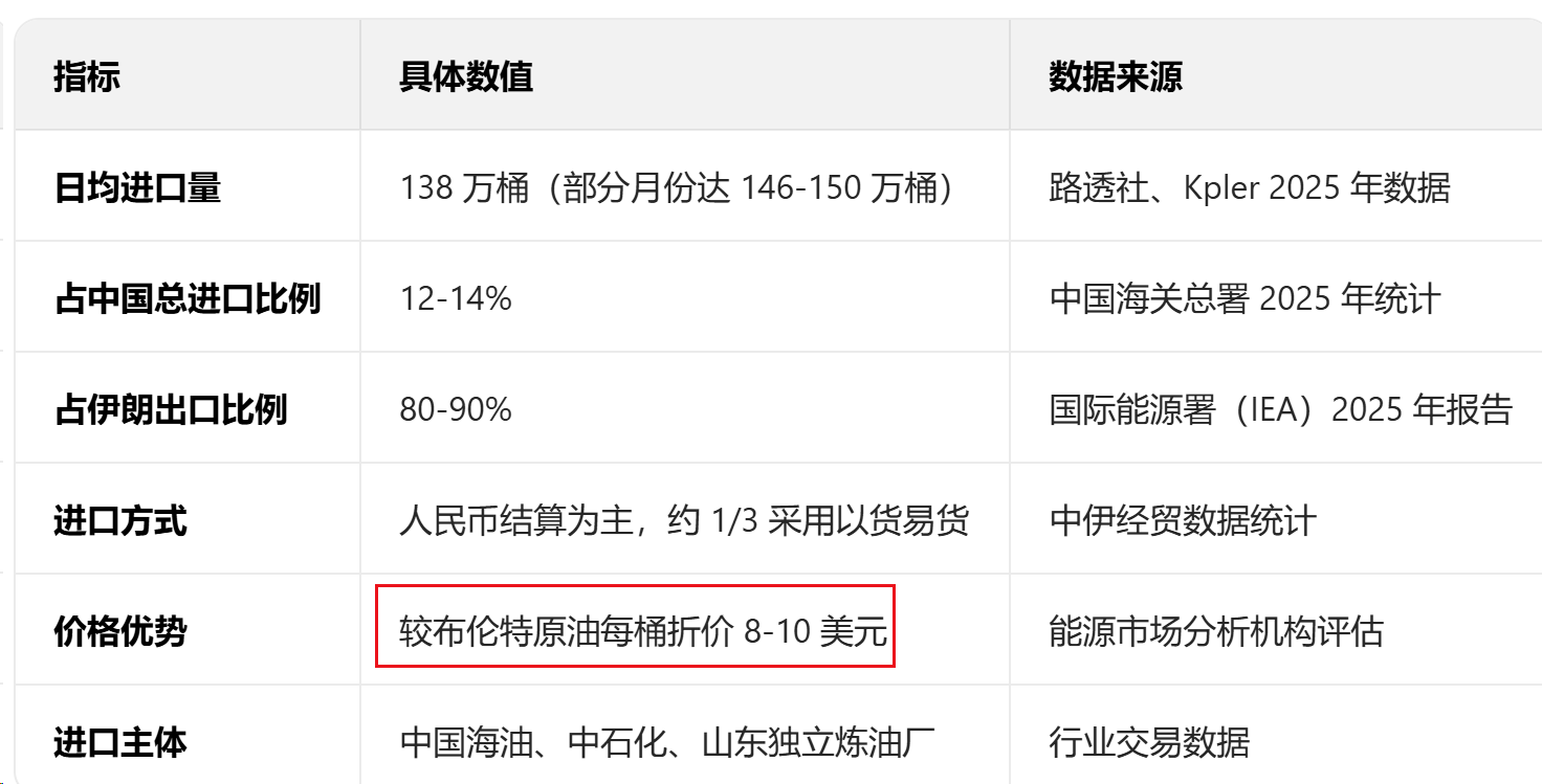 中国日均进口伊朗原油约138万桶(2025年数据),占总进口量12-14%,承接伊朗80-90%石油出口。