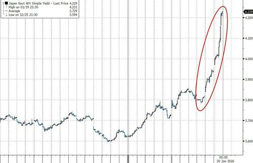 除了围绕格陵兰岛归属引发的关税和地缘政治争端外,周二全球市场的另一大风暴眼无疑在日本。日本40年期国债收益率周二一举飙升至了4%以上,创下自2007年推出以来的新高,也是三十多年来该国所有期限主权债务收益率首次突破该关口。