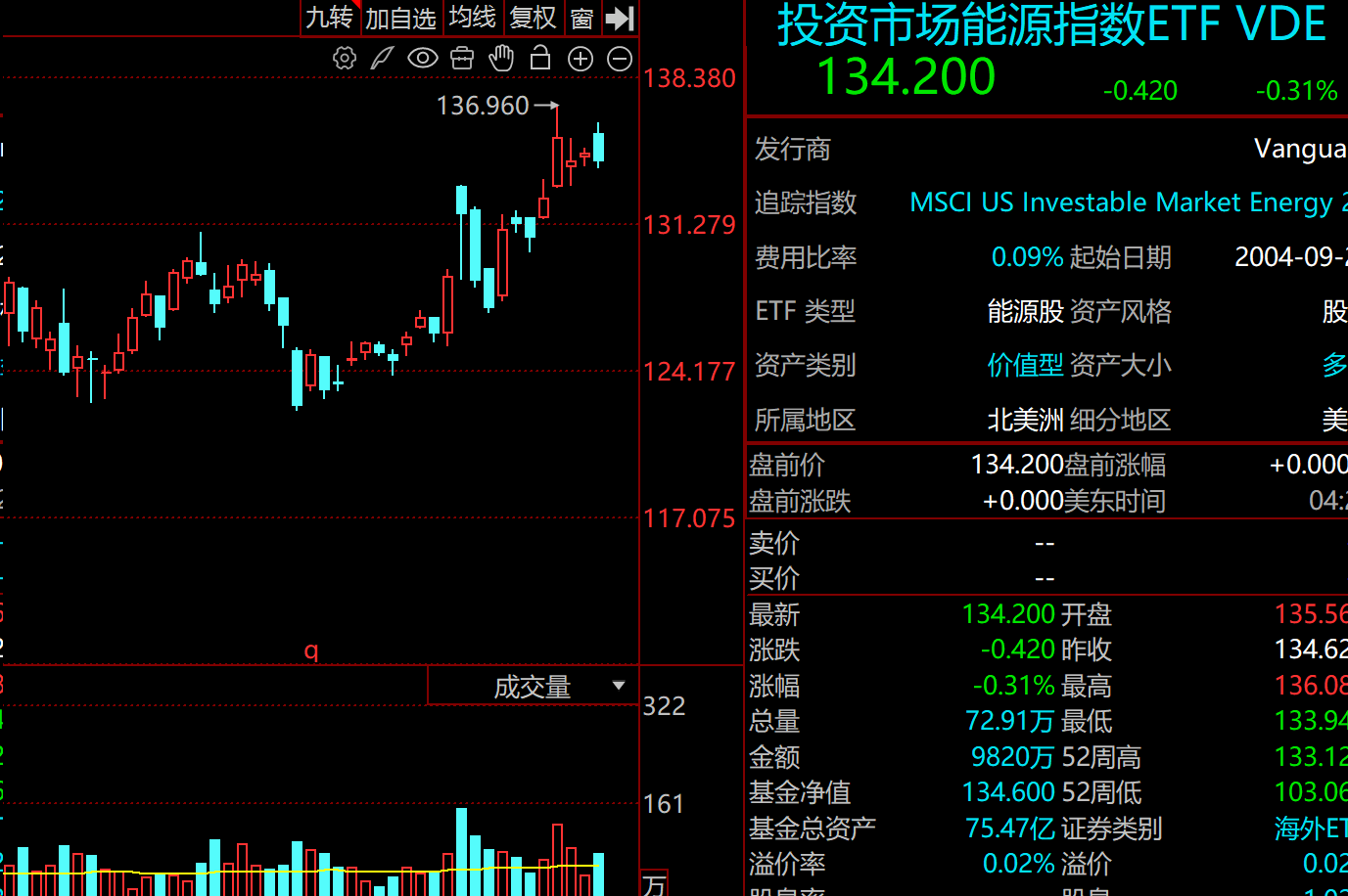 近期美股科技股回调的时候,先锋能源ETF却在逆势吸筹。其盘中价格一度从约132美元附近被暴力拉升至136美元附近,成交量异常放大,这不仅仅是一个板块轮动的信号,更是一次避险模式的底层切换:资金正在从高估值的成长股,搬运到与能源价格挂钩的硬资产上。