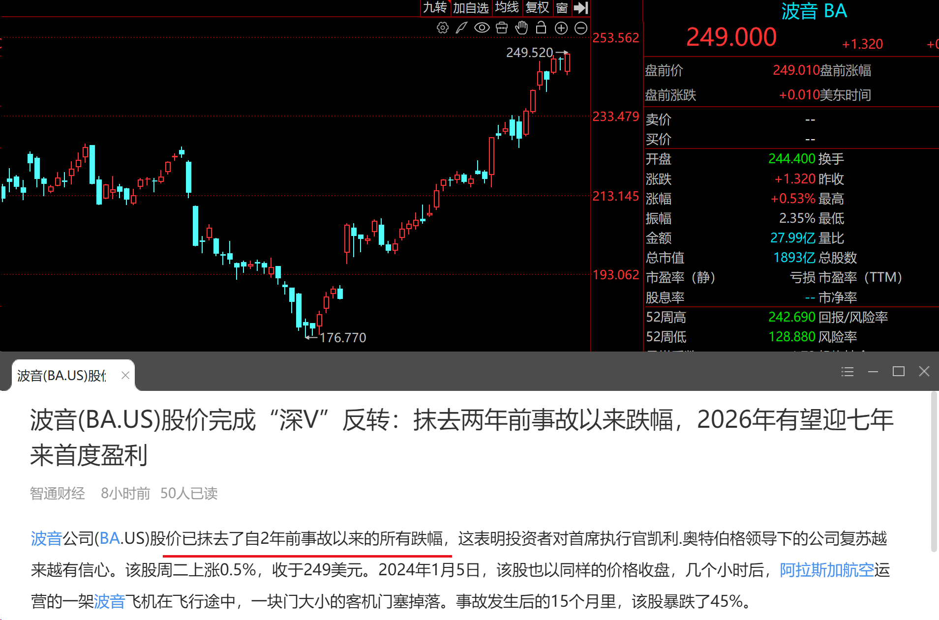 波音公司(BA.US)股价已抹去了自2年前事故以来的所有跌幅,这表明投资者对首席执行官凯利.奥特伯格领导下的公司复苏越来越有信心。波音公司预计将于2026年实现七年来的首次年度盈利。在4月份关税恐慌期间股价一度跌破137美元后,该股的反弹表明投资者认可管理层的决策。