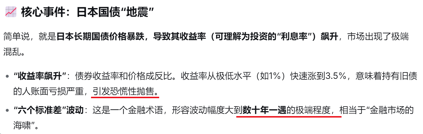 美国财政部长贝森特周二表示,他已与日本对口官员进行了交谈,此前日本政府债券遭到抛售。他表示,此次抛售已经波及到美国国债市场。而曾有数十年对冲基金经理生涯的贝森特也表示,日本债券市场出现了“六个标准差”的波动幅度。