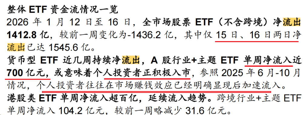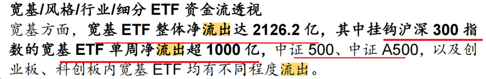 上周,宽基ETF整体净流出达2126.2亿,其中挂钩沪深300指数的宽基ETF单周净流出超1000亿,中证500、中证A500,以及创业板、科创板内宽基ETF均有不同程度流出。
