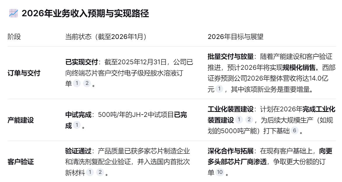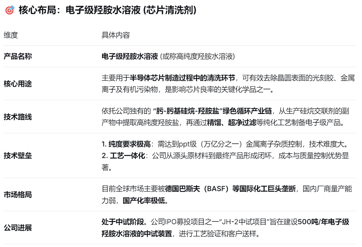锦华新材在半导体领域的布局,是其从传统化工向高科技材料转型的核心战略。具体可概括为:以核心绿色循环技术为基础,攻关“芯片清洗剂”——电子级羟胺水溶液,可有效去除晶圆表面的光刻胶、金属离子及有机污染物,是影响芯片良率的关键化学品之一。目前全球仅巴斯夫具有电子级羟胺水溶液工业化生产能力。公司已成功开发电子级羟胺水溶液产品,产品质量同巴斯夫产品相当,已通过多家芯片制造企业和清洗剂复配企业验证。