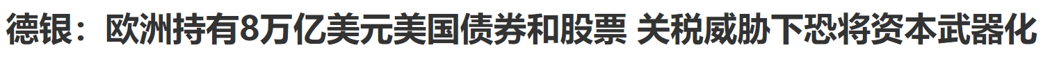 德意志银行全球外汇研究主管George Saravelos周日在给客户的报告中写道,欧洲是美国最大的“出借方”,欧洲各国合计持有8万亿美元的美国债券和股票,几乎是世界其他地区总和的两倍。“在美国净国际投资头寸处于纪录最负极值之际,欧美金融市场的相互依存度从未如此之高。”Saravelos指出。“真正会对市场造成最大冲击的,将是资本的武器化,而非贸易流本身。”