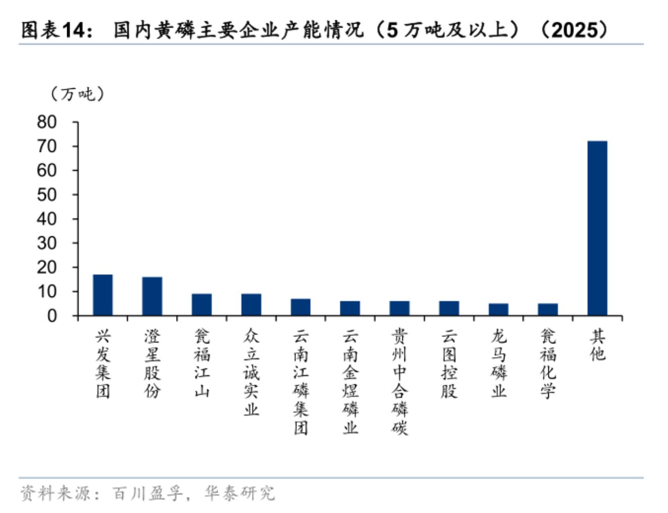 同时,2025年国内黄磷生产企业中,5万吨(含)以上产能企业仅10家,包括兴发集团(17万吨/年)、澄星股份(16万吨/年)、云图控股(6万吨/年)等,其余5万吨产能以下占比达46%、2万吨(含)及以下产能占比达14%。