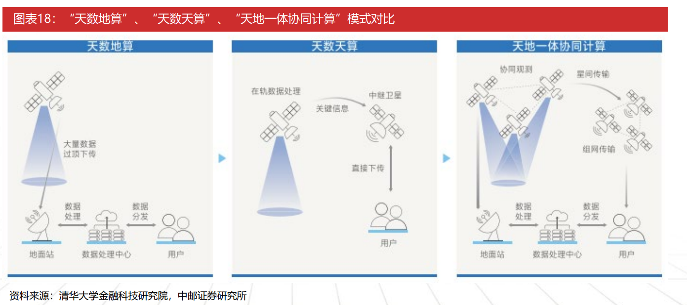 传统卫星“天数地算”低效的计算与传输模式催生了“天数天算”乃至“天地一体协同计算”的太空算力模式发展。一方面,传统的“天感地算”模式受限于地面站资源、带宽等因素,仅有不到十分之一的有效卫星数据能传回地面,且存在数据时效较差等问题。另一方面,卫星作为承载遥感观测、通信、灾害预警等关键任务的核心载体,面临着从单向“数据采集”转向“边缘智能”,再到“天地一体化”智能算力运营的跃迁趋势,催生了“太空计算”这一场景。