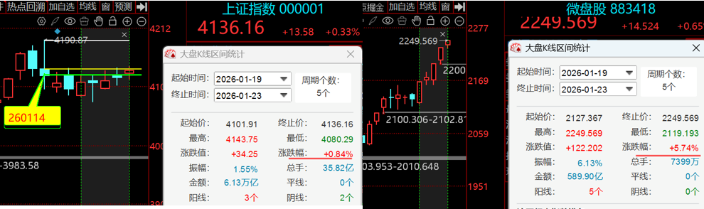上周(2026年1月19日-23日)大盘权重指数表现相对疲软,而微盘股、中证500、中证1000指数则涨幅居前 。市场风格偏向“重个股、轻指数” 。