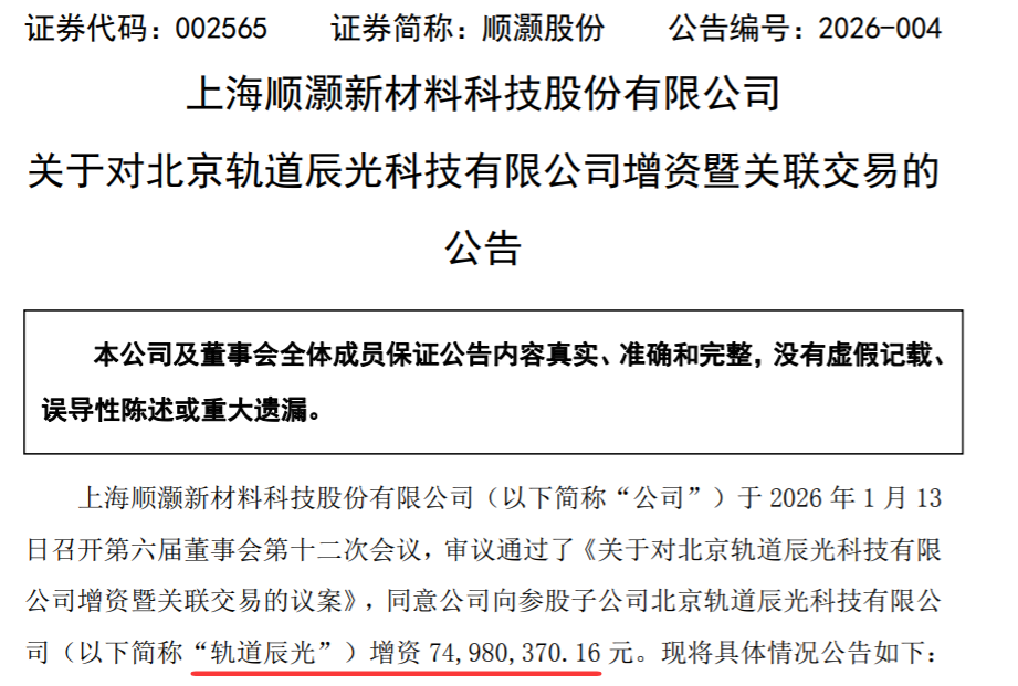 2026年1月,出于对轨道辰光未来发展前景的看好,顺灏股份以自有资金 7498万元 对轨道辰光进行增资 。增资完成后,顺灏股份的持股比例将提升至 28.68%。