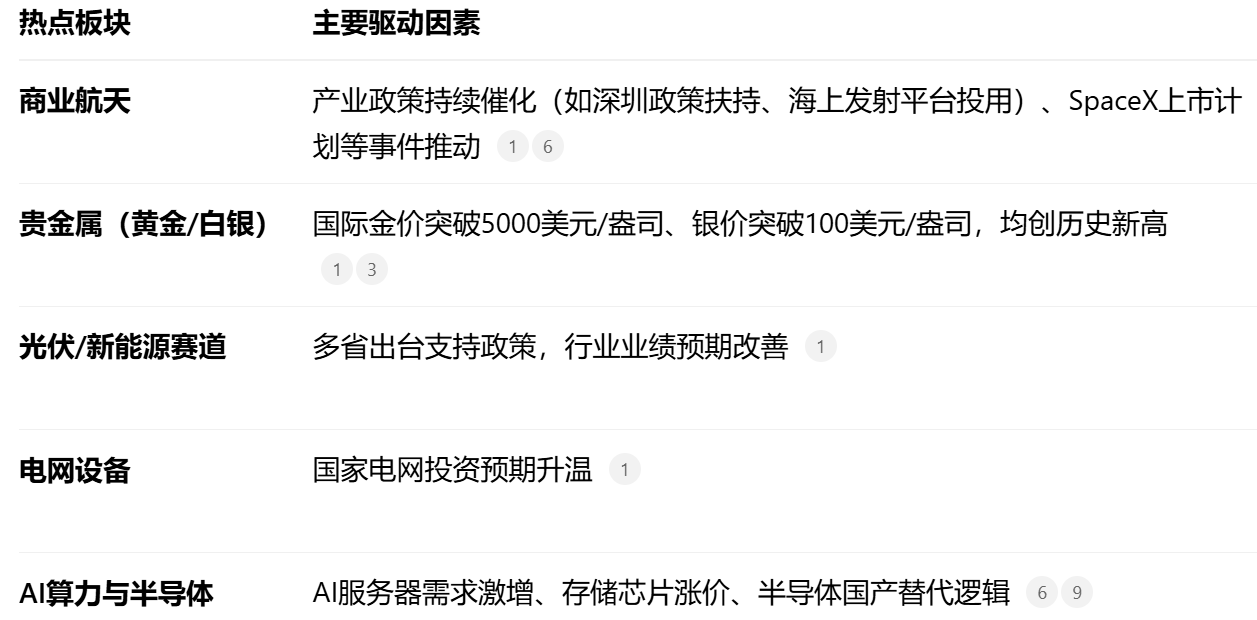 A股市场出现了几个明显的热点板块。金属(受金价创新高推动)、航天装备、半导体、太空光伏和AI算力产业链等板块持续受到资金追捧。