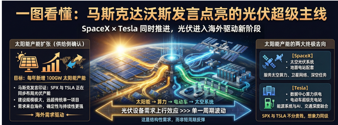 马斯克表示SpaceX和特斯拉正分别努力在美国实现每年100吉瓦的太阳能部署,这大概需要三年时间。当地时间1月22日,特斯拉CEO埃隆·马斯克突然现身瑞士达沃斯世界经济论坛,与贝莱德CEO拉里.芬克展开对话。马斯克在采访中表示:“1)SpaceX和特斯拉正分别努力在美国实现每年100吉瓦的太阳能部署,这大概需要三年时间;2)如果我们能证明星舰的完全重复使用——希望就在今年——这将是深远的进步。进入太空的成本将降低100倍。进入太空成本大幅降低后,在太空部署AI数据中心就成了顺理成章的选择。太空非常冷,只要背对太阳,就是一个完美的冷却系统。我认为在两年内,太空将成为运行AI成本最低的地方。