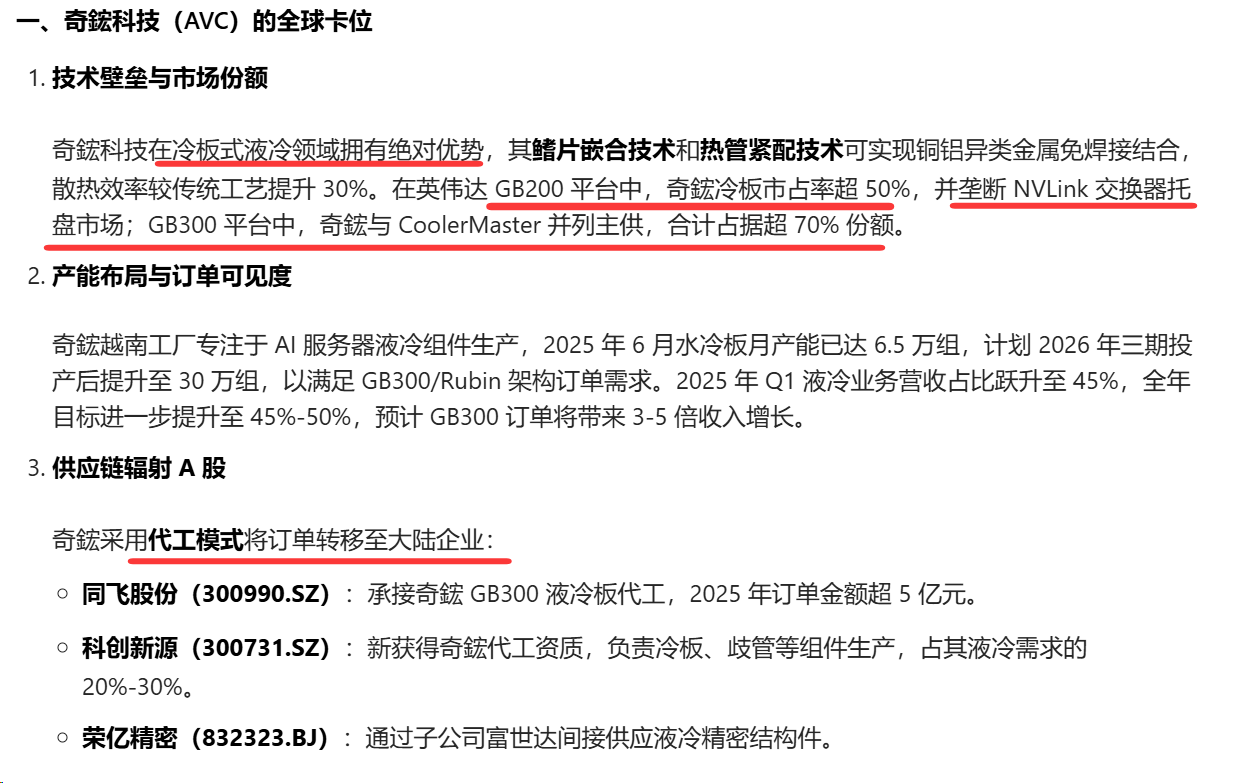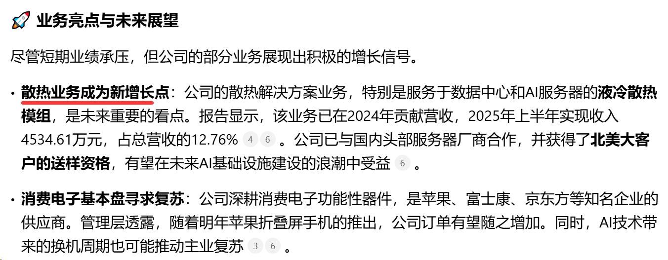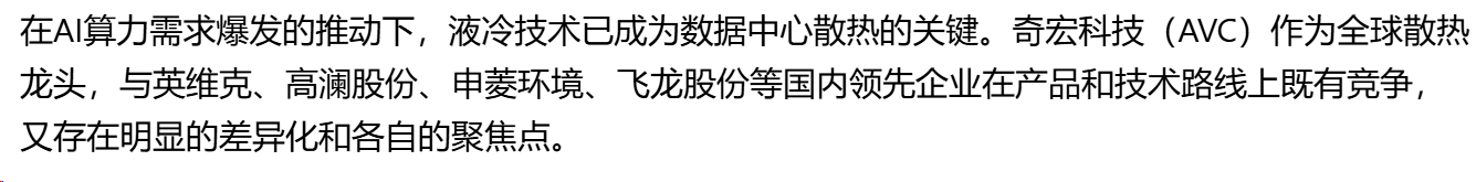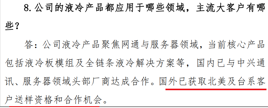 在2026年1月21日鸿富瀚(301086)发布调研纪要中披露,公司液冷产品聚焦网通与服务器领域,当前核心产品包括液冷板模组及全链条液冷解决方案等,国内已与中兴通讯、服务器领域头部厂商达成合作;国外已获取北美及台系客户送样资格和合作机会。下一阶段,公司将持续聚焦主业深耕细作,在稳固传统业务的基础上,把液冷模组作为重点突破方向,全力推进市场拓展,积极寻求更多大客户合作支持,助力业务规模与效益双提升。
