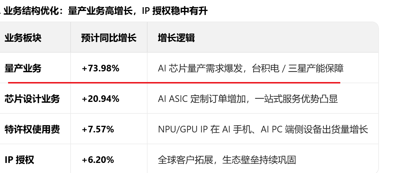 量产业务的增长不仅是“量”增,更是“质”升。公司在5nm等先进工艺上已有成功流片经验,并已为知名新能源车企提供5nm车规级自动驾驶芯片定制服务。这些高端、复杂的芯片项目一旦量产,价值量远高于传统芯片,直接驱动了收入的高增长。
