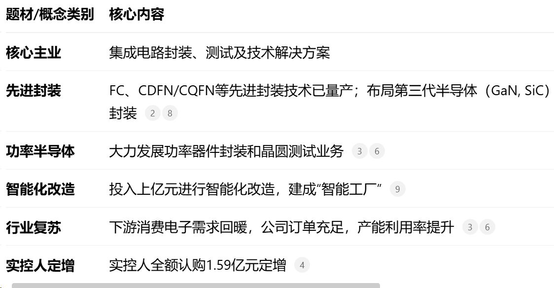 重点发力第三代半导体(氮化镓GaN、碳化硅SiC)的封装与测试。其5G基站用GaN射频功放塑封封装技术已通过客户验证,并持续研发大功率碳化硅芯片塑封封装技术。这使其在新能源汽车、5G通信等高端应用封测领域建立了早期技术储备。