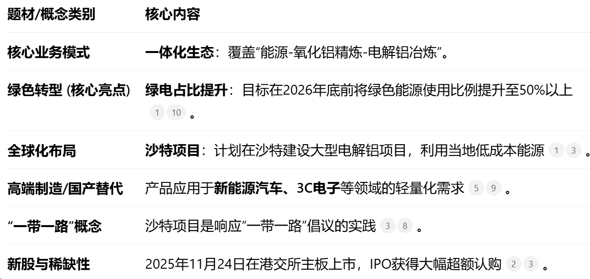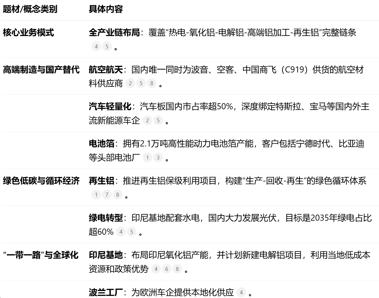 公司专注于铝产业链上游的龙头企业,其投资价值主要体现在全产业链成本优势、绿色转型潜力以及全球化布局这几大核心题材上。
