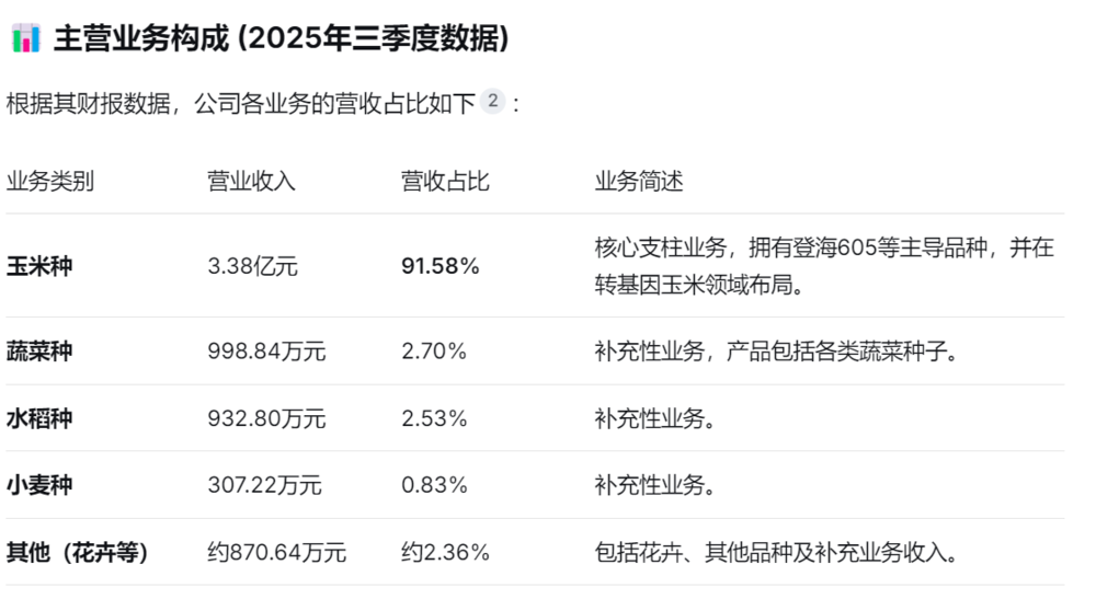 种子产业:是公司的核心业务,产品线丰富,包括杂交玉米种子、青贮玉米种子、杂交水稻种子、常规水稻种子、小麦种子、西瓜甜瓜种子、油菜种子等。2024年,公司种子产业实现营业收入10.77亿元,占公司总营收的36.81%。是公司盈利能力最强的业务板块。