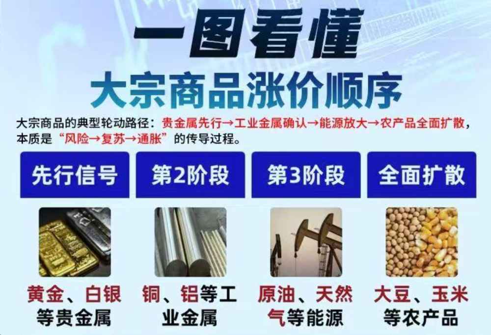 过往多次大宗商品的上涨周期表面,各大品种都有着较为明显的联动规律,整体遵循“贵金属先行—工业金属确认—能源放大—农产品全面扩散”的经典轮动路径。