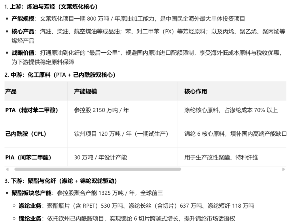 公司是全球领先的 "炼油 — 化工 — 化纤" 全产业链一体化龙头,秉持 "一滴油,两根丝" 战略,构建国内独有的 "涤纶 + 锦纶" 双主业驱动模式,依托文莱炼化与国内聚酯产业的境内外协同,形成上中下游垂直整合的产业结构。