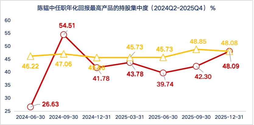 数据来源:Wind,基金定期报告,红色是陈韫中任职年化回报最高产品的持股集中度,即重仓股票市值占基金净值的比例,橙色为同类基金的平均水平
