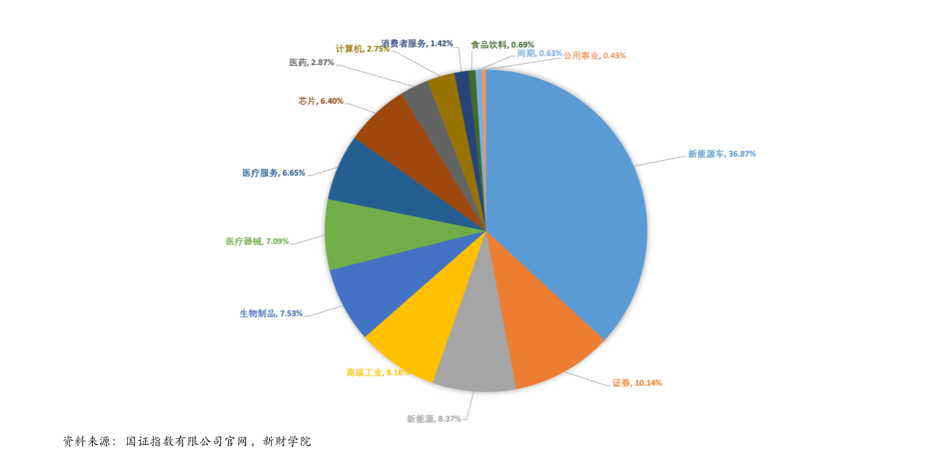 总体来看,新能源、医药整体和证券三大方向累计占比79.52%,占据了指数绝大多数的权重。
