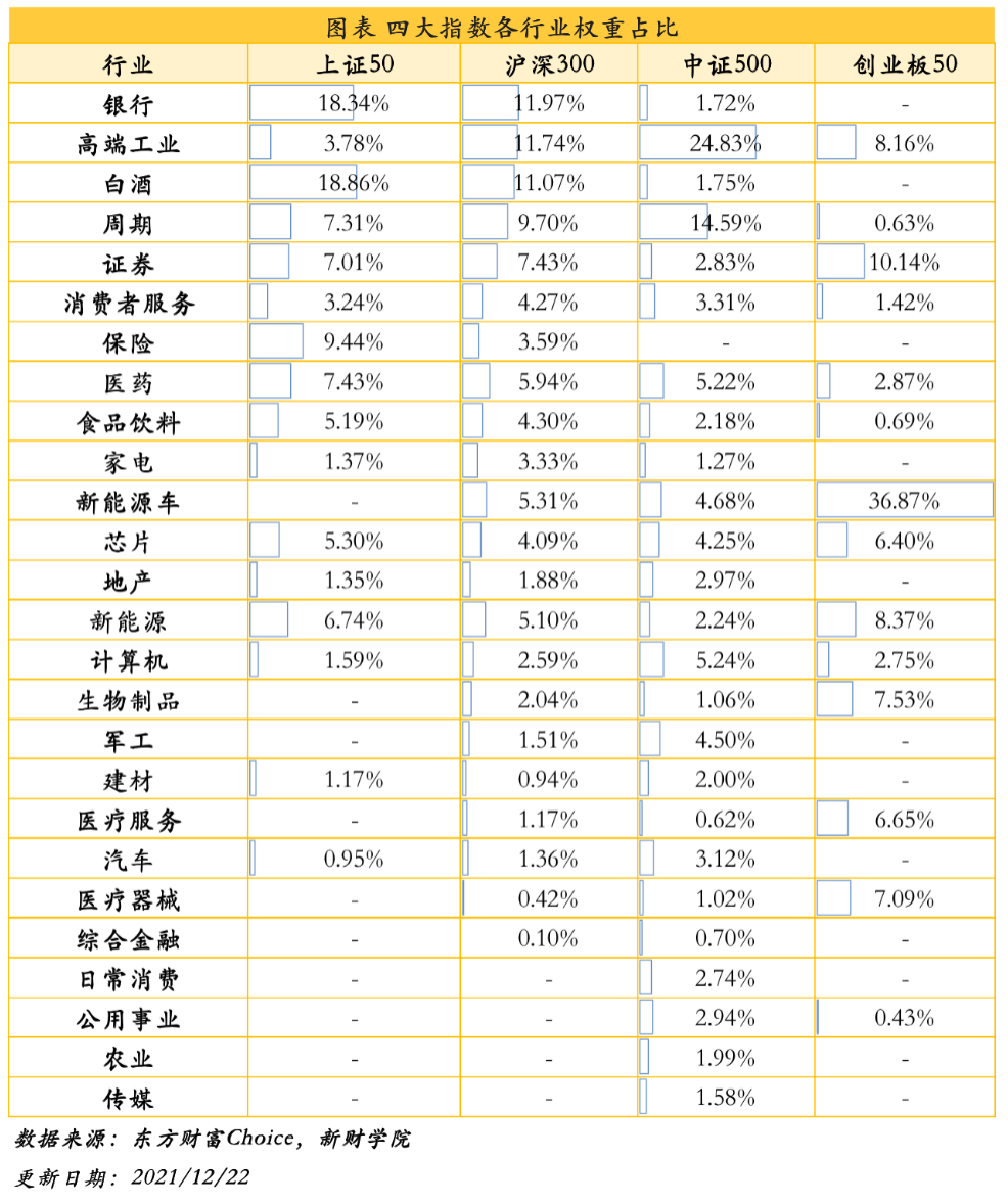 此前,在关于上证50、沪深300、中证500和科创50的四期指数专题中,我们将上证50总结为偏向金融、消费,平均市值在3000亿以上的大盘指数;沪深300是覆盖面更全,制造业属性更强,平均市值在1000亿以上的大盘指数;中证500是带有典型传统工业、周期色彩,平均市值在200亿-500亿之间的中盘指数;科创50是偏高端制造业,平均市值在300亿-600亿的中盘指数;而创业板50则是偏新能源、医药方向,平均市值在700亿-2000亿之间的大盘指数。