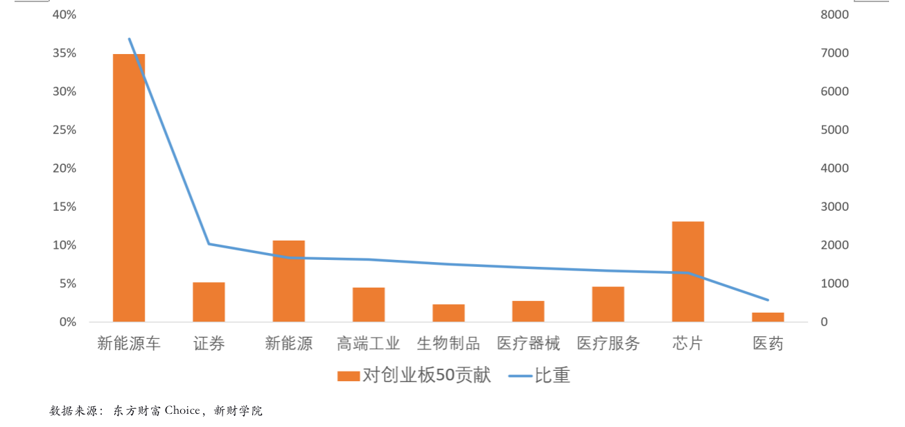 下图可以看出,驱动创业板50上涨的,正是占比最高的新能源和占比仅6.4%的芯片。
