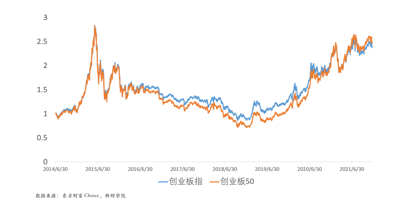 其实也确实如此,创业板指和创业板50的权重股高度重合。虽然创业板指比创业板50多了50只个股,但尾部50只个股占比实在太小,重合部分个股权重差异又不大,所以自2014年科创50成立以来,创业板50和创业板指的走势高度相近,根本没有拉开特别大的收益率差距。