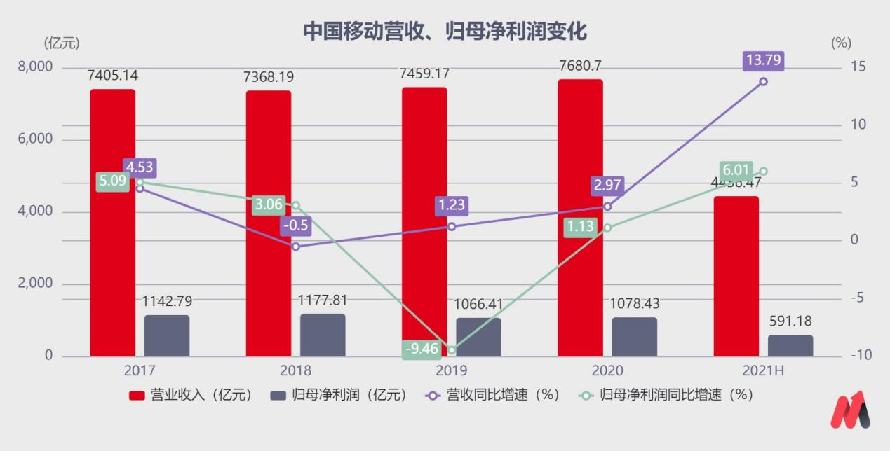 随着中国的人口红利消失,中国移动的个人市场业务收入也出现了瓶颈了。从近几年的营收增速表现来看,2017年-2020年公司营收增速均小于5%。而在2021年上半年,公司的营收实现4436.47亿元,同比增长13.79%;重新出现了较高增长的迹象。究其原因,主要靠有限宽带业务、政企业务带动。