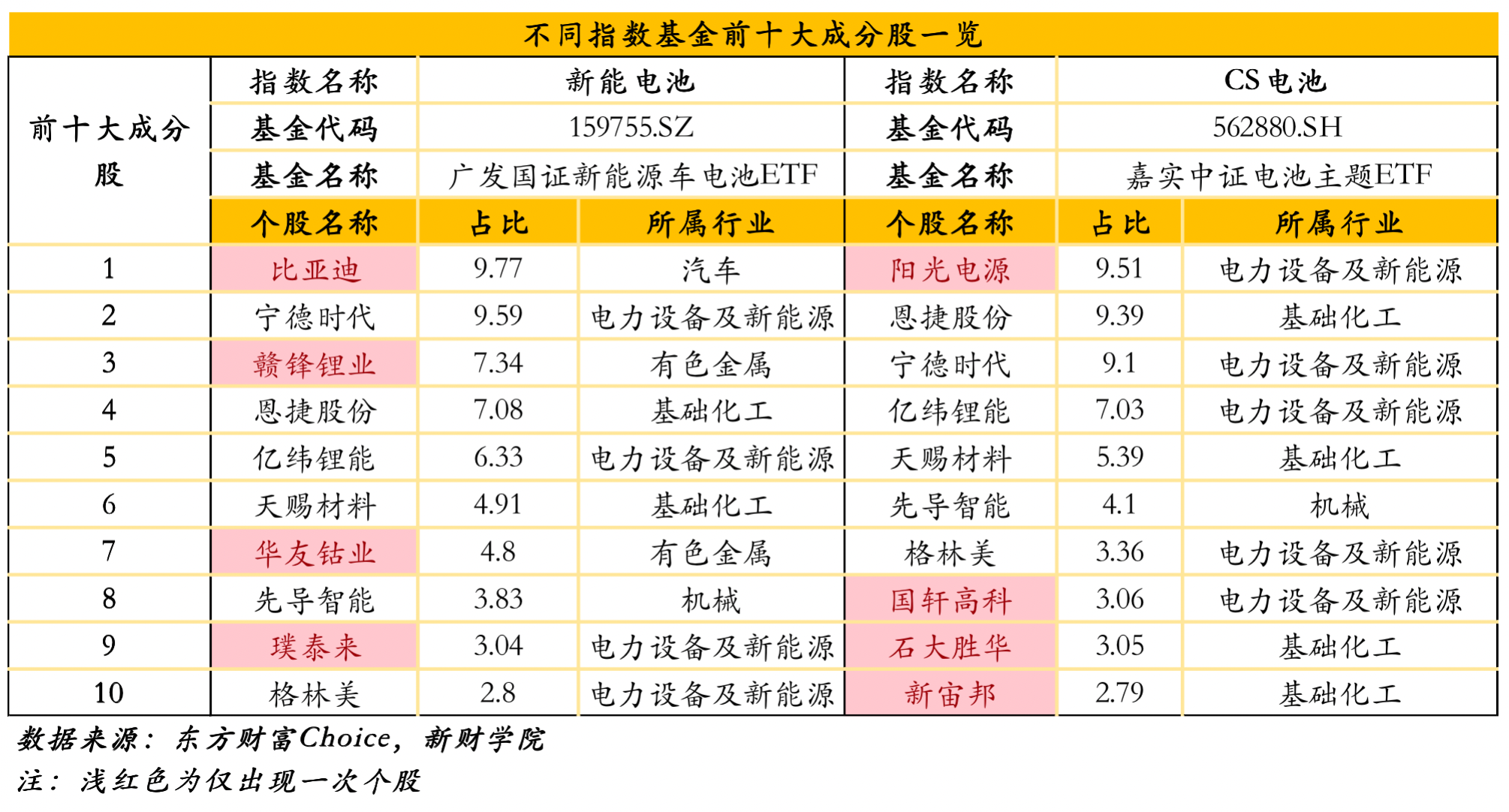 目前市场上跟踪新能源电池方向的指数有两个,一个是新能电池,一个是CS电池。但大家要注意这两个指数并不一样。其中新能电池是由国证指数编制的一只跟踪新能源车电池产业的指数,CS电池是中证编制的投向动力电池、储能电池、消费电子电池以及相关产业链上下游的指数。前者可以通俗理解为“新能源车电池”,后者可以理解为“储能电池”,这两者覆盖的范围其实差距不小。