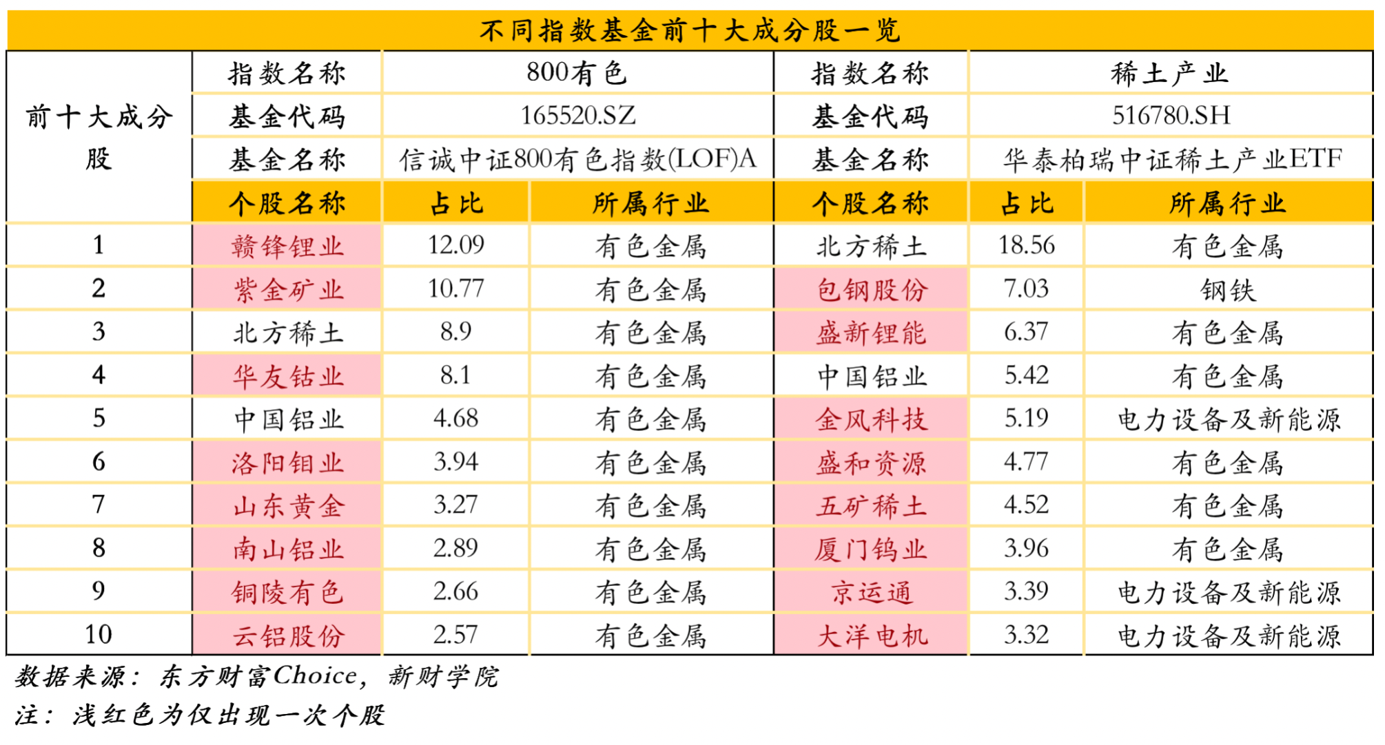 跟踪稀土方向投资的指数只有一个稀土产业,跟踪的指数基金有六只。这个指数的权重股基本上就和有色金属方向的权重股差异比较大了,主要都是稀土产业链里的标的。