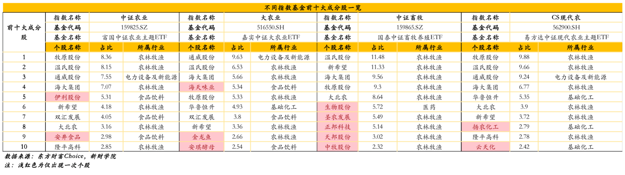 目前全市场跟踪农业方向投资的指数有三只,畜牧养殖的指数有一只。三只农业指数分别是中证农业、大农业以及CS现代农,畜牧养殖指数是中证畜牧。从三只农业指数基金的权重股上我们可以看到排名靠前的也基本都是养殖企业,仅在排名靠后的权重股中有部分涉及农业的食品标的有所差异。中证畜牧的权重股则和其他三只指数的权重股差异较大,主要是提升了本来位于后面的养殖类个股的权重,剔除了和养殖无关的个股。
