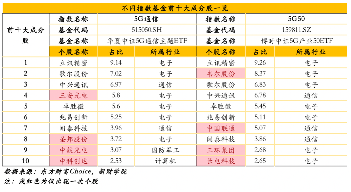 这两个指数在权重股上的差异比较明显,其中5G通信的权重成分股基本以芯片相关的标的为主,走势会跟芯片行业关联性更大。而5G50则包含更多的消费电子和电信运营商等标的,覆盖的方向更全面,更有行业代表性。