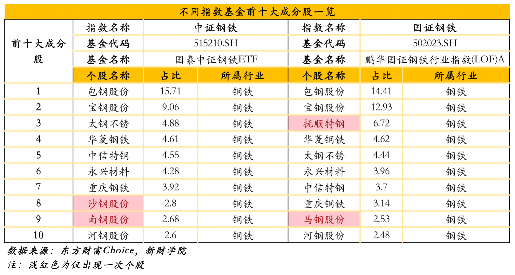 目前,市场上跟踪钢铁方向投资的指数有两个,分别是中证钢铁和国证钢铁。这两个指数分别由中证指数和国证指数两家公司编制,不过在成分股上基本大同小异,只有细微的标的和权重差异。