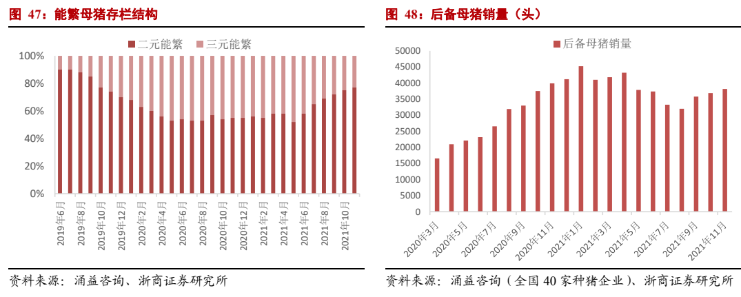 除了上述直观的产能表现之外,还有一个隐形产能的概念也是本轮周期中“不一样”的地方。虽然能繁母猪目前环比产能出现下降,但存栏结构正在被优化,即淘汰低效三元母猪逐渐替换成更高效的二元母猪。这就意味着,即使总的能繁母猪数量在下降,但是二元母猪比例在提高,所以很难判断产能是否有效降低。