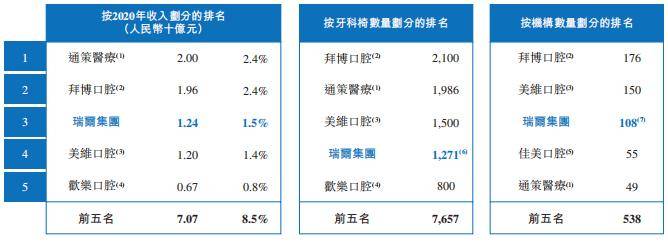 瑞尔集团是全国性的口腔医疗服务集团,在中国15个主要一二线城市运营111家医院及诊所。根据弗若斯特沙利文的数据,以2020年的总收入为统计口径,瑞尔集团排名第三位;按照牙椅数量排名,瑞尔位列第四位。
