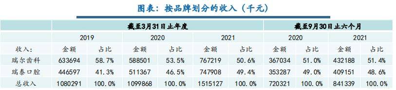 从价格定位上看,高端口腔医疗服务其挂牌价格较三级甲等医院高出至少25%,而中端口腔医疗服务比三级甲等医院价格高出约10%。从收入占比来看,瑞泰口腔的占比在持续提升,2021财年已经接近50%,高端和低端品牌的占比各一半。