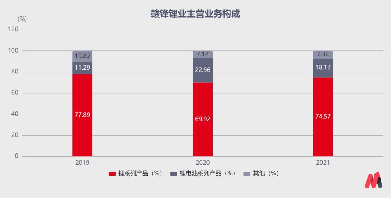 作为销售锂电池原材料的锂盐企业,赣锋锂业的主营业务分为3部分:(1)锂系列产品,以电池级碳酸锂、电池级氢氧化锂等为主;(2)锂电池、锂电芯及其直接材料;(3)其他。其中,公司的锂系列产品占主营收入比例为74.57%。