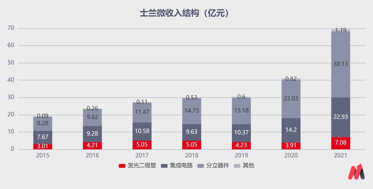 士兰微成立于1997年,经过20多年的发展,不断扩充产品线,目前形成了分立器件(MOSFET、IGBT、二极管等)、集成电路(MEMS传感器、电源管理芯片、功率IC、IPM模块等)、LED (LED芯片、LED封装等)三大业务板块。