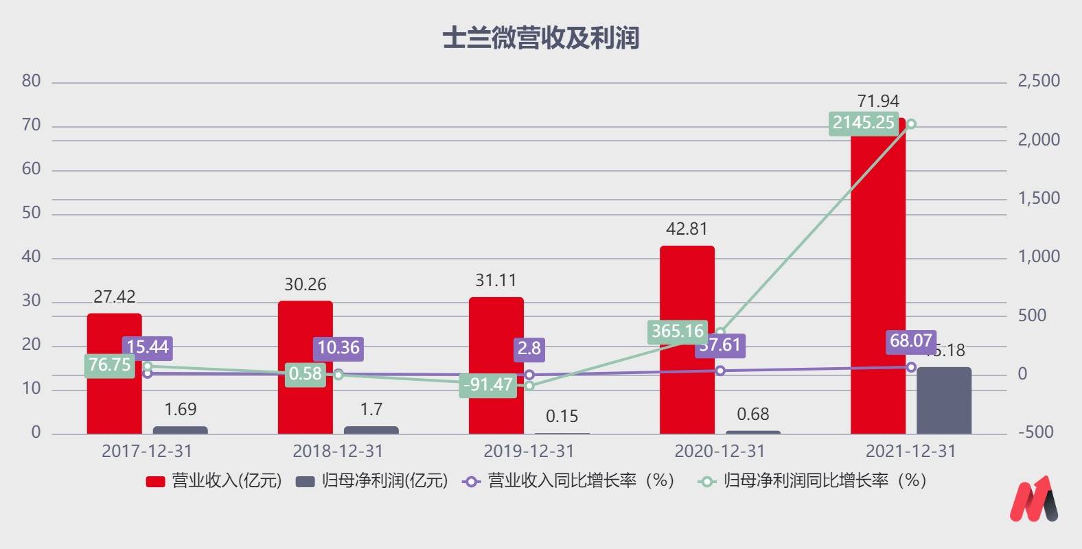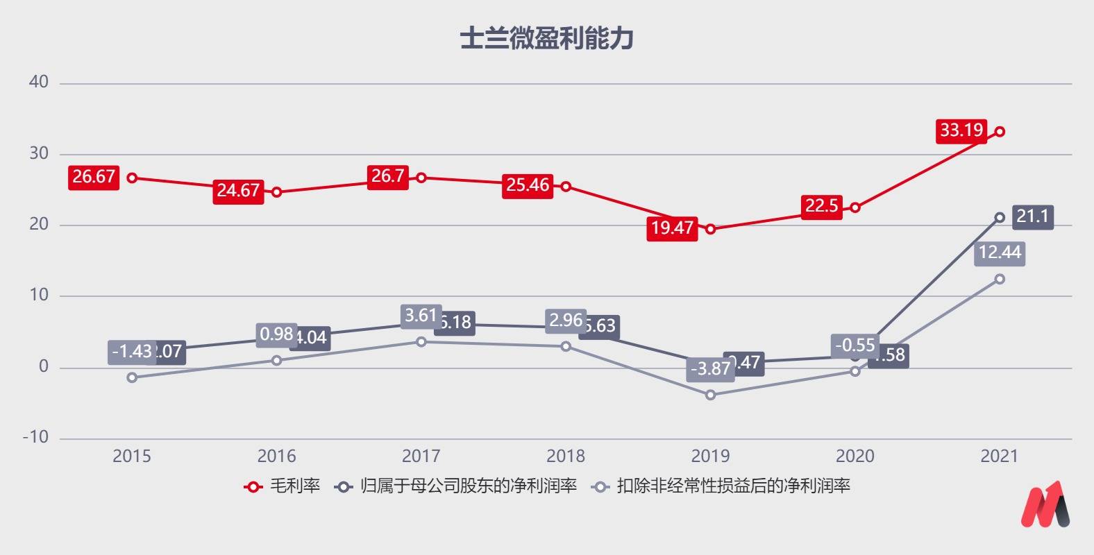 叠加产品结构优化、产能利用率提升,士兰微的盈利能力大幅增强。根据公司年报显示,2021年公司实现营业收入72亿,同比增长68%,归母净利润15.2亿,同比增长高达21倍,扣非后净利润为8.95亿元,同比扭亏。(公司持有的安路科技及视芯科技股权公允价值变动,影响公司非经常性损益6亿左右)