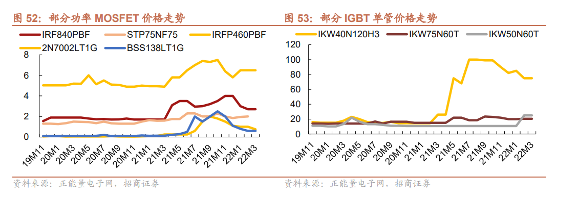 另外,中低端的功率半导体产品价格也有所回落。从功率半导体近期相关的价格数据也可以看到,中高压功率器件2022年3月部分MOSFET 产品渠道价格持续分化,部分中低压MOSFET价格持续下滑,高压MOSFET渠道价格相对稳定,IGBT整体价格平稳。