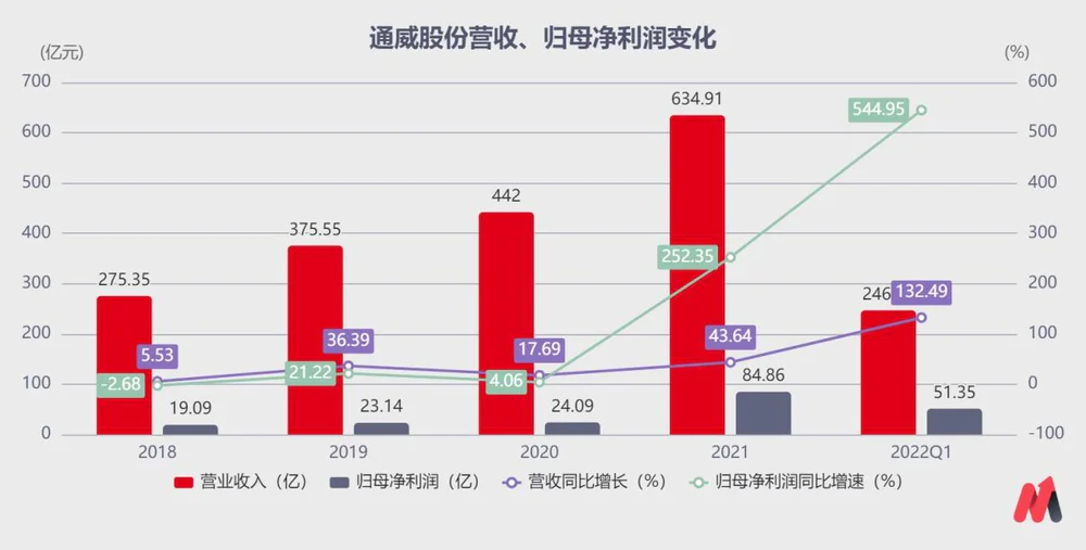 作为光伏上游硅料的龙头企业,通威股份高纯晶硅产量全球第一。近日,通威股份发布2021年年报及2022年Q1财报,2021年通威股份实现归母净利润82.08亿,同比增长252.35%;2022年Q1通威股份实现归母净利润51.94亿,同比增长513.01%。业绩数据可谓十分亮眼。