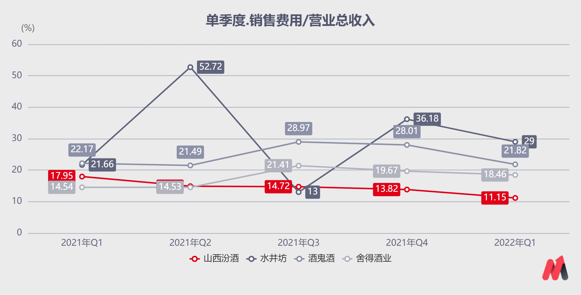 在销售费用率投放上,四家公司的2022年一季度数据有明显的分化:水井坊销售费用同比增加7.3个百分点,由销售费用大幅提升的同时,收入端增速显著放缓导致;舍得销售费用率同比增加3.9个百分点;而汾酒由于高基数与规模效应一季度销售费用下滑明显,同比减少约6.8个百分点;酒鬼酒销售费用率同比减少0.35个百分点。