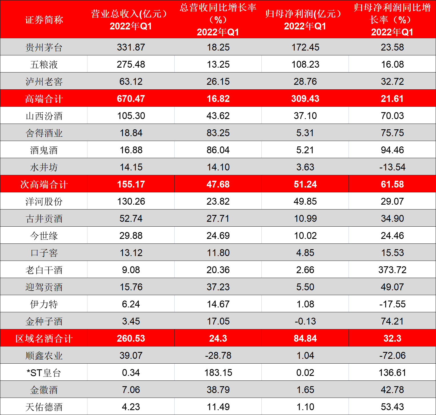 对比看,2022年第一季度总营收同比增速表现:次高端(+47.7%)>区域名酒(+24.3%)>高端白酒(+16.8%);归母净利润同比增速表现:次高端(+61.6%)>区域名酒(+32.3%)>高端白酒(+21.6%)。