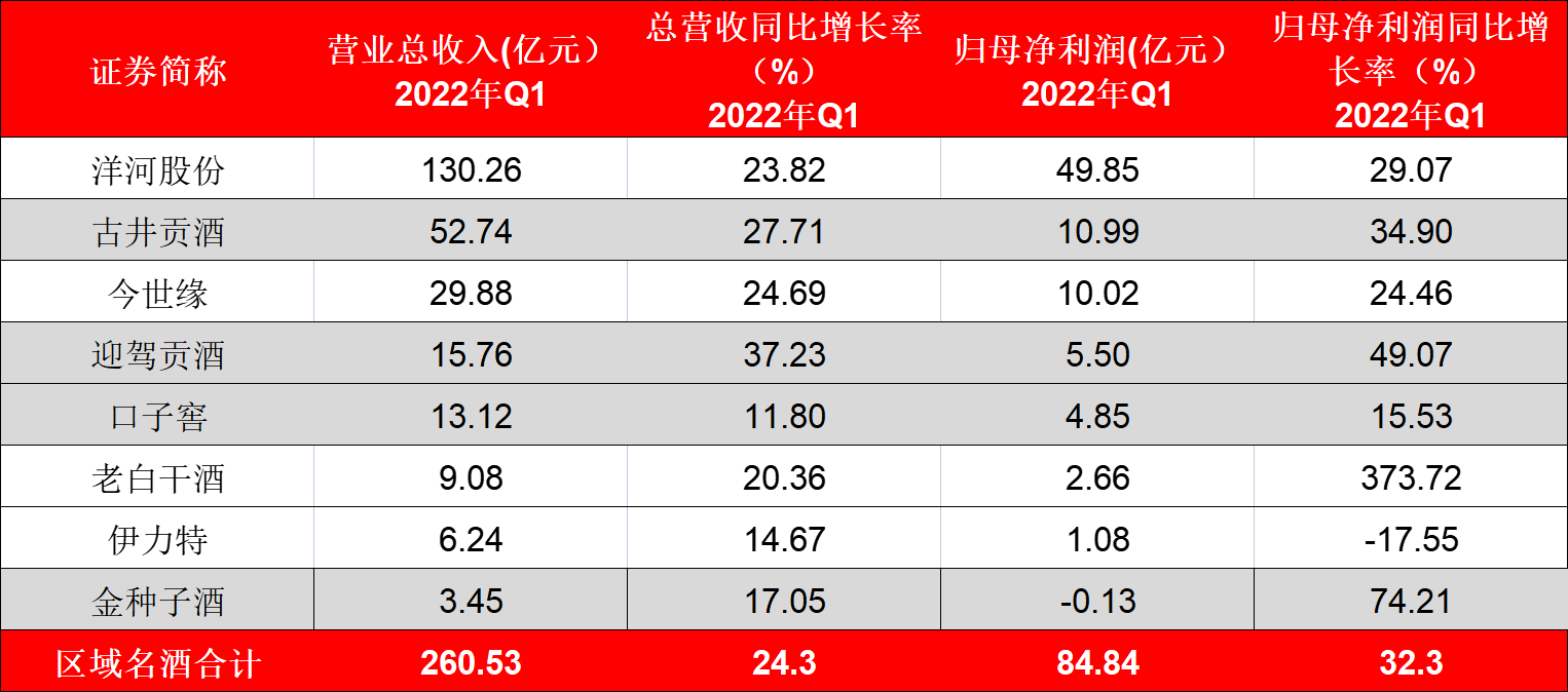 在春节返乡回补以及地方投资拉动下,2022年一季度,区域名酒合计创收260.53亿元,同比增长24.3%,归母净利润合计约84.84亿元,同比增长32.3%,实现了季度加速。