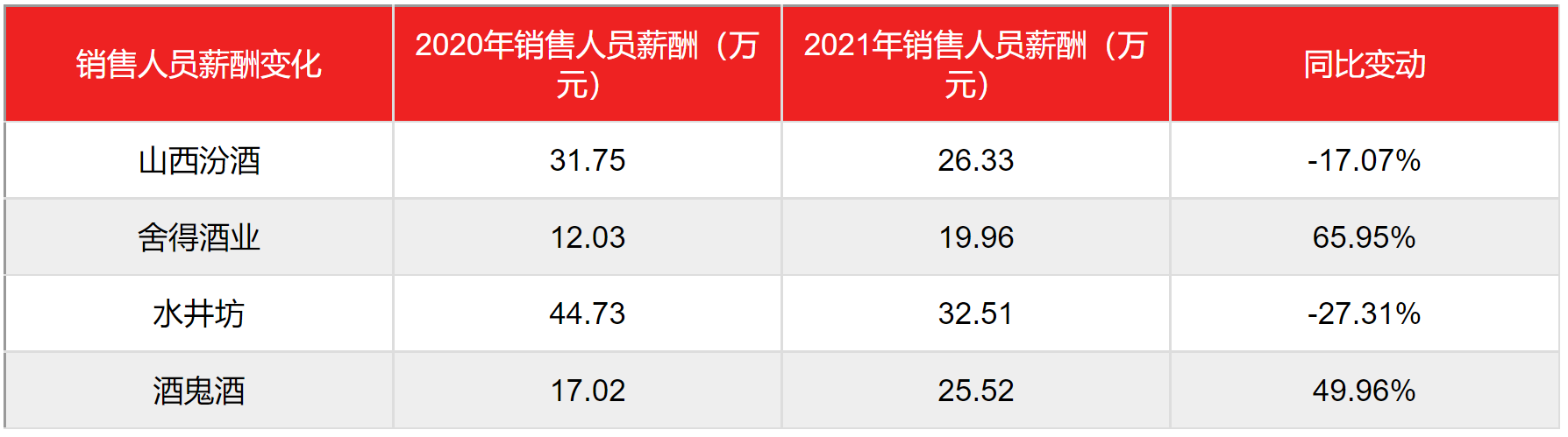 最后是企业销售人员薪酬方面,四家酒企也出现了明显分化:2021年舍得销售人员人均薪酬同比提升65.95%,酒鬼酒同比提升49.96%,提升了企业整体的内在动力。而汾酒同比下降17.07%,水井坊同比下降27.31%(水井坊2021年推出了股权激励方案)。