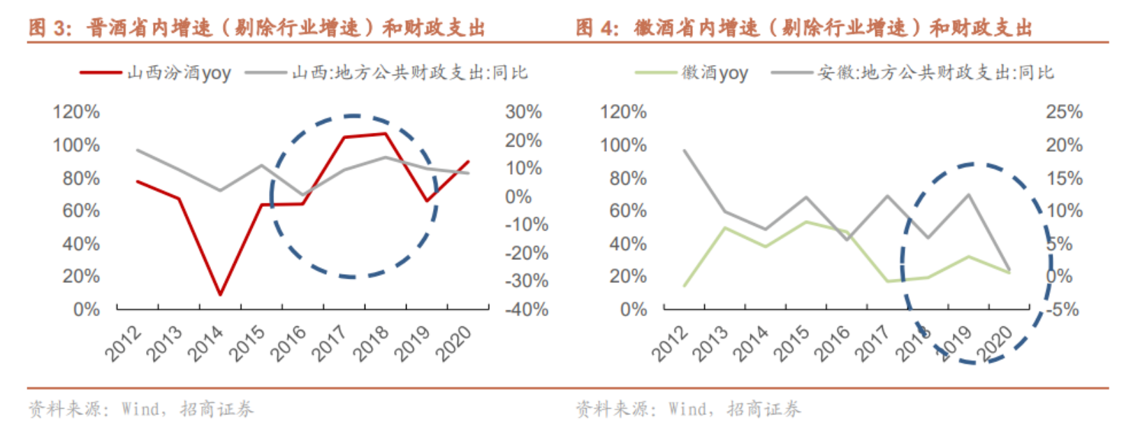 回顾2016-2020年晋酒、徽酒和苏酒的省内业绩也可以发现:与当地财政支出力度大的年份,区域名酒省内收入也有不错的增长。