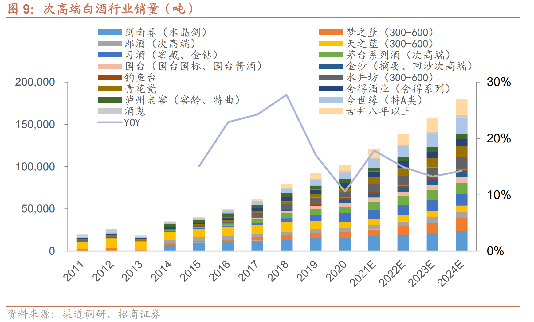 从产品端分析,高价位带的布局对于企业提升品牌形象,产品口碑以及渠道利润都有着重要意义,因此500-800元价格带将是白酒行业未来几年的重要增长极。多家券商预计500-800元价格带未来几年整体增速仍将保持在35%以上,成为企业成长的重要推动力。