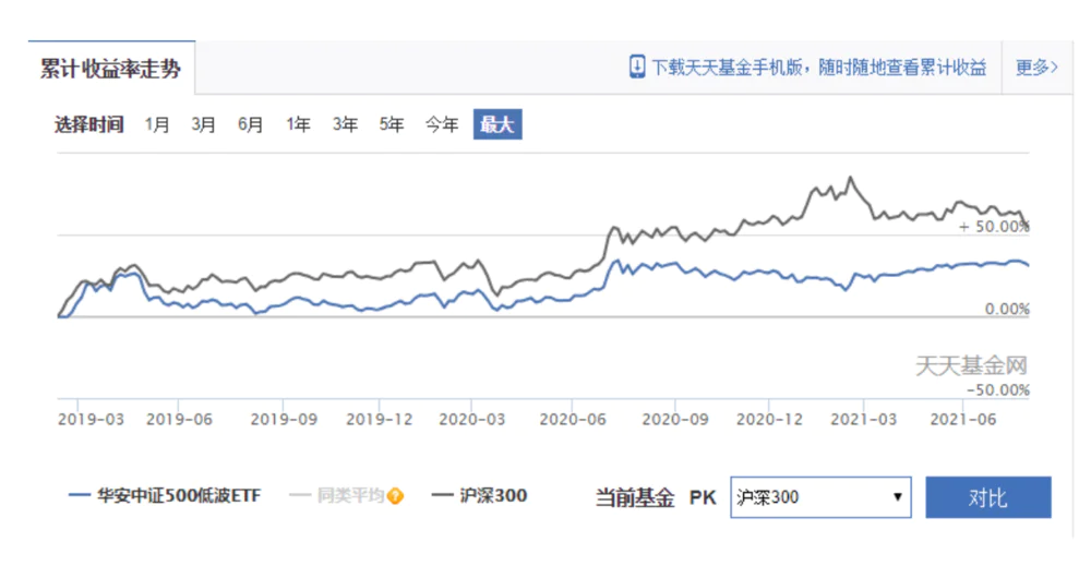 那么这些低波动指数基金的收益怎么样?大家来对比一下两个基金,一是华安中证500低波动ETF,二是标准线沪深300。