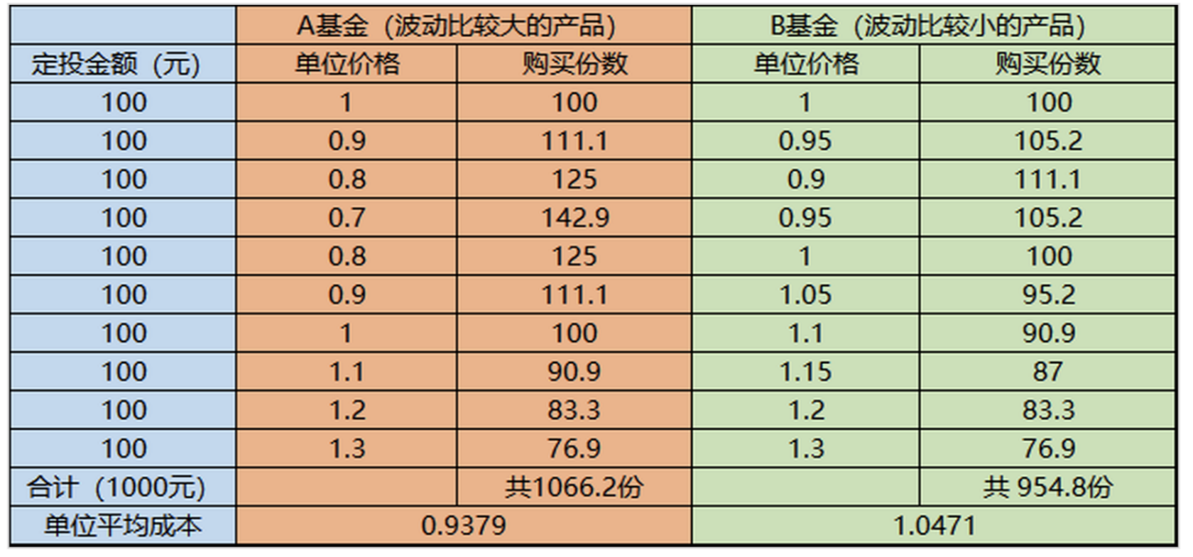 假如每个月定投A和B基金各100元,共定投1000元,把他们的收益率做成一个表格,你会看到波动率小的B基金赚了24% , 波动率大的A基金赚了39%。