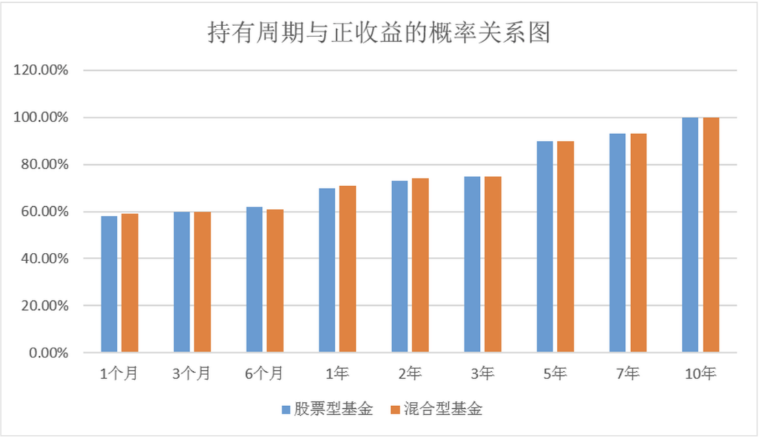上面这张图的数据来自于一家头部基金公司,它的标题是持有周期和正收益的概率关系图。简单来说这张图表示了在中国的A股市场,基金的持有时间越长,你获得的正收益概率越大,持有基金如果超过10年的话,你获得正收益的概率几乎达到了100%。
