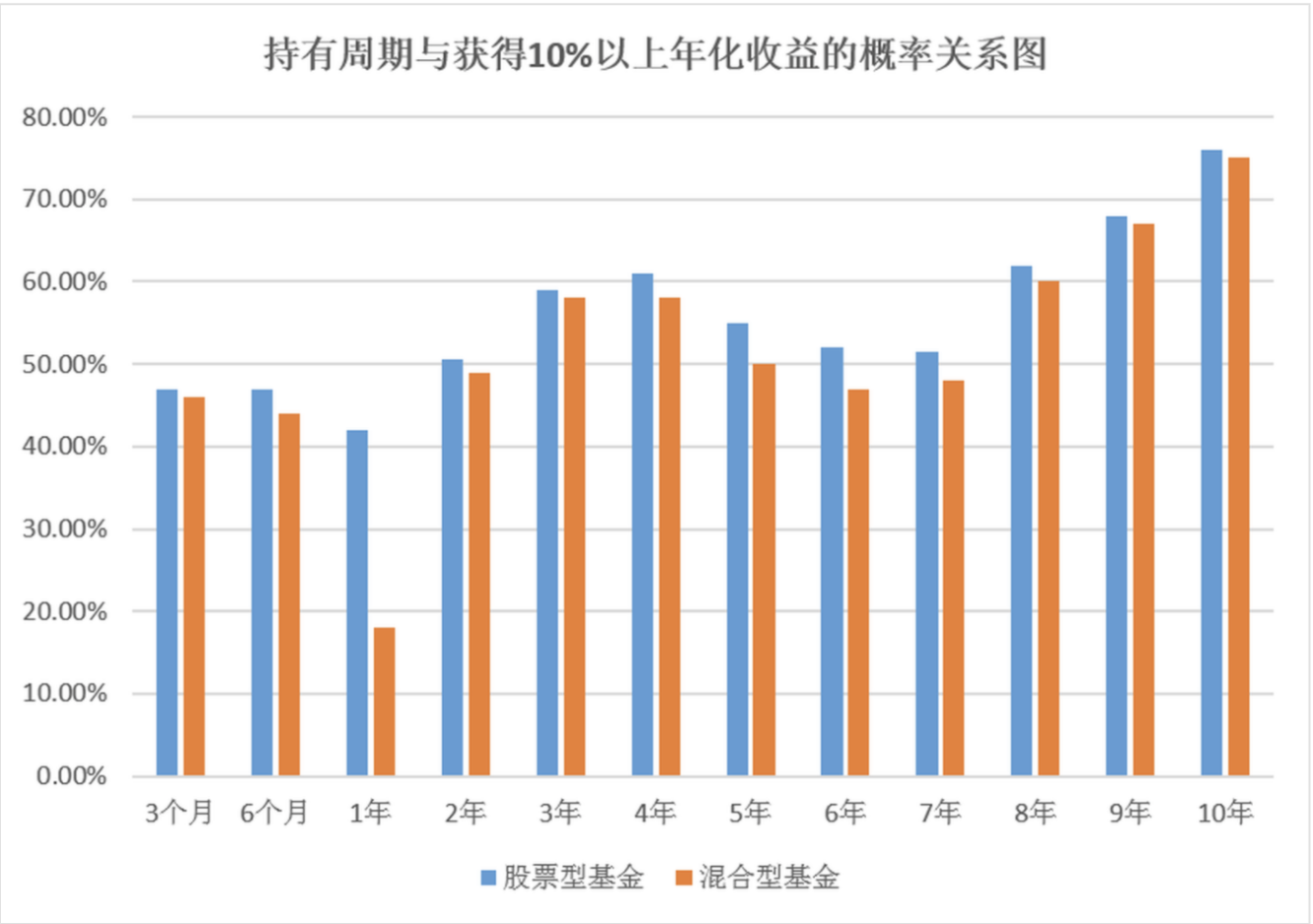 当然上面说的是正收益,也就是你不亏损,你能够保本的概率是100%。我们每个人投资基金本质上不是为了保本,是为了获得更高的收益,那么我们就需要参考下面这张图,也就是你持有几年,你获得10%以上收益率的概率是最大的。